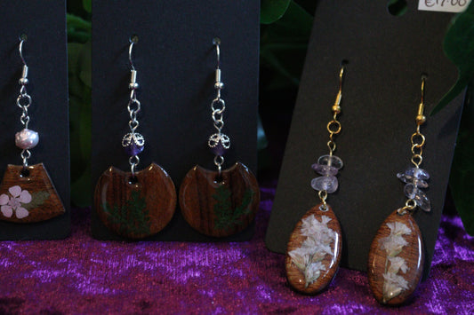 Walnut Wood Flower & Crystal Earrings