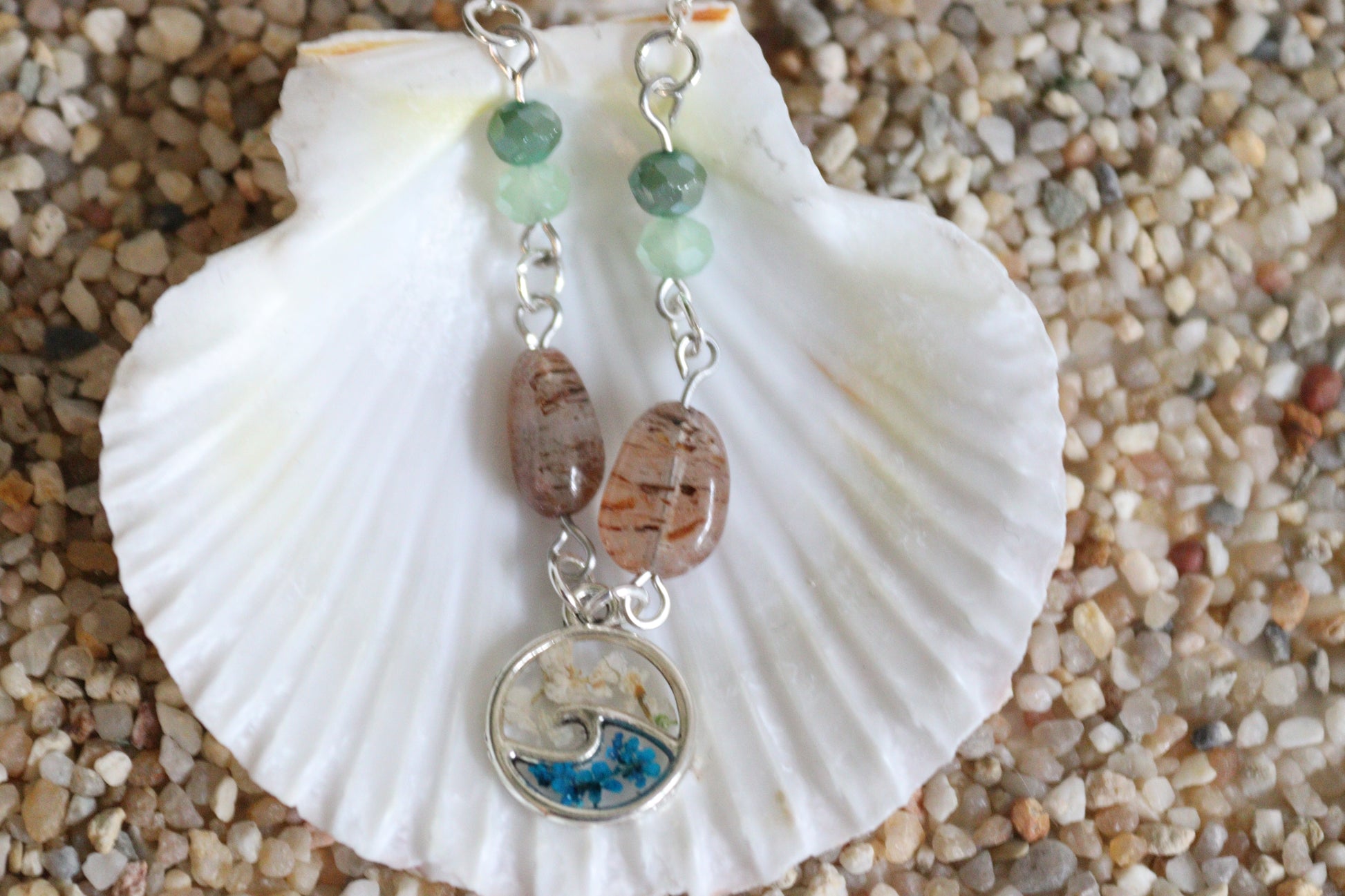 The Wavy Necklace is handcrafted with high quality Rutilated Quartz and Czech Glass in accenting a central silver bezel in the shape of a wave, in which there are inlaid many tiny blue and white Queen Anne's Lace flowers.
